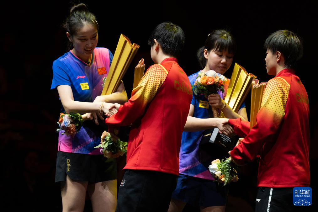 10月5日,陈幸同(右二)/钱天一(左一)和孙颖莎(左二)/王艺迪在颁奖仪式上相互致意。