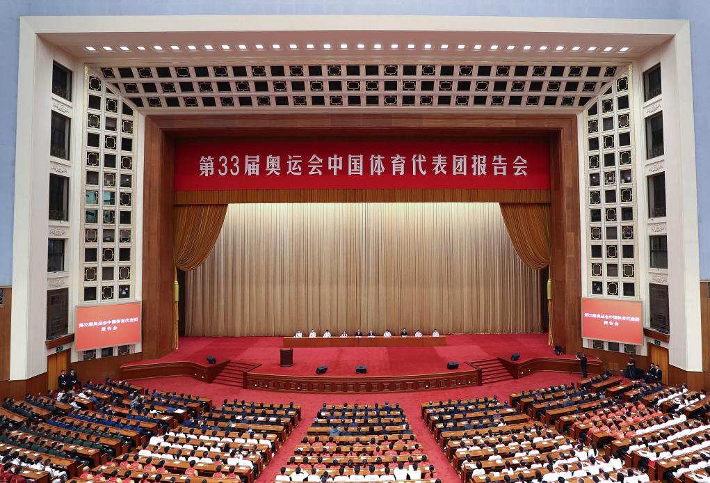 新华社北京11月15日电 中央宣传部、国家体育总局15日下午在人民大会堂举行第33届奥运会中国体育代表团报告会。