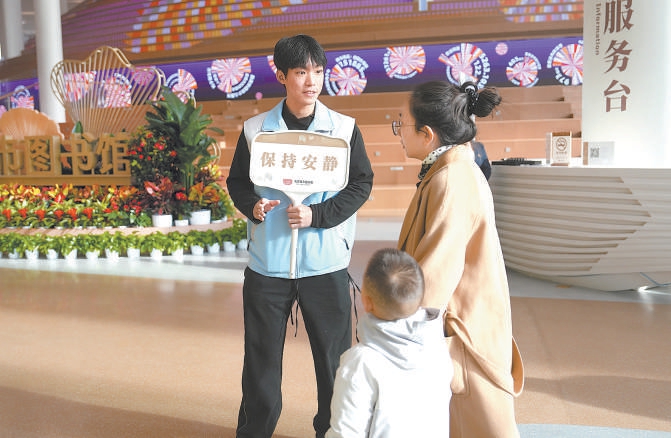 如此“资深”的志愿者,在北京城市图书馆也随处可见。托举着“保持安静”的提示牌,两步一个高台阶,图书馆开门还不到半小时,中国戏曲学院学生志愿者赵娄菀菲已经把森林书苑的整座“山体”巡视了两圈,期间还熟练地帮几位读者找到了想看的书籍。“看到志愿者的一个眼神、一个动作,读者就会自觉地降低音量。我们要做的就是露出亲切的微笑,给读者带来愉悦的阅读体验。”和她一样身穿蓝色马甲的志愿者,也在穿梭中随时提醒读者,保持安静,文明阅读。