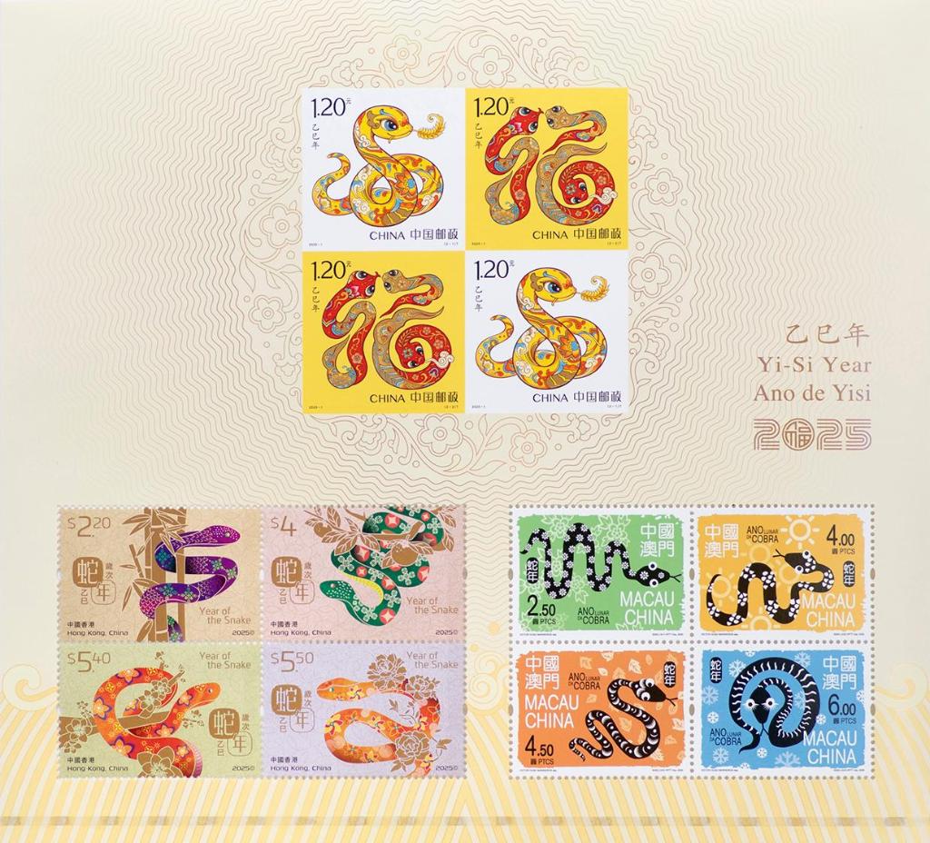 中国邮政携手港、澳邮政部门共同印制的生肖同题材邮票三地小全张。