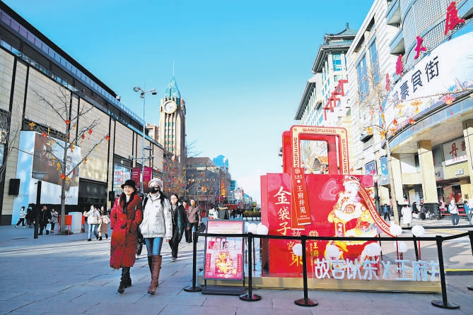 王府井步行街上,喜庆的新春装饰让游客感受到浓浓年味儿。实习记者 金瑶摄