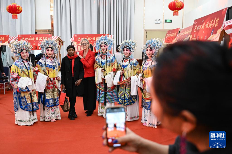1月17日,在北京市朝阳区麦子店街道和中国国际青年交流中心共同主办的新春嘉年华活动上,外国友人与京剧演员合影留念。