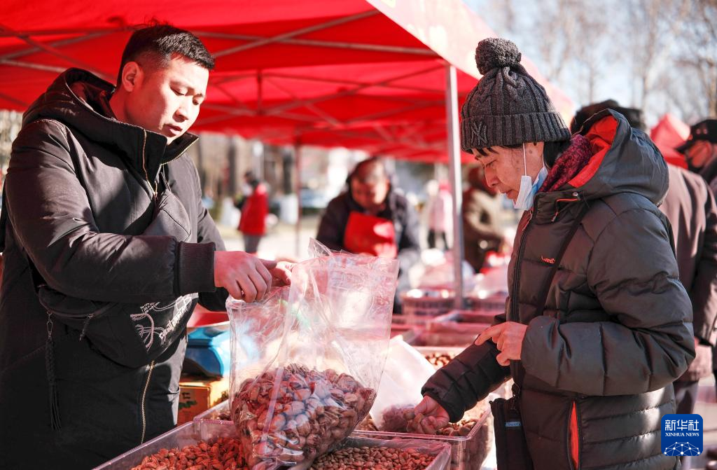 1月19日,北京市海淀区青龙桥街道的居民在“年味市集”上购买年货。