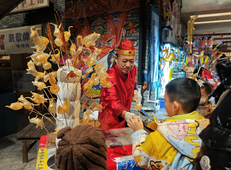 除了民俗表演,庙会上还有非遗互动市集,剪纸、漆扇、棉花糖等十多个摊位前,游客们摩肩接踵。“一二三,走!”在吹糖人摊位上,老手艺人将手中的糖泥包裹在竹签上,形成一个小小的糖球,随着手指控制竹签巧妙旋转,一个栩栩如生的眼镜蛇糖人儿就出炉,递到了小食客的手中。正是蛇年,由工作人员装扮的“白娘子”和“小青”也吸引了不少人合影打卡。