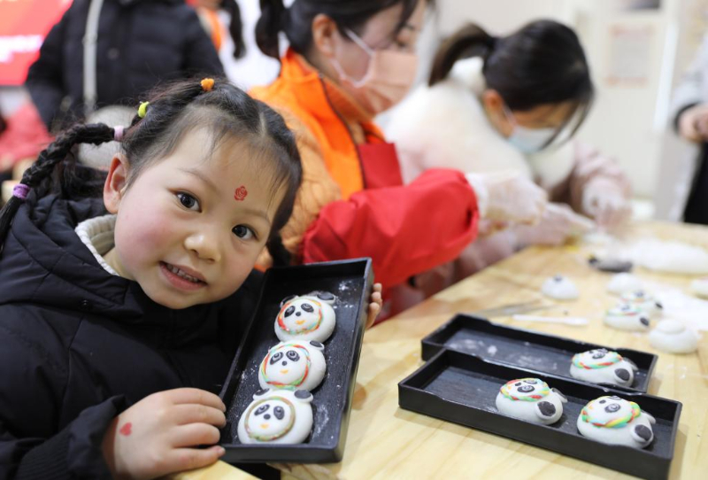 2022年2月13日,在安徽省芜湖市繁昌区新光社区新时代文明实践站,人们在制作“冰墩墩”创意汤圆。新华社发(杨华 摄)