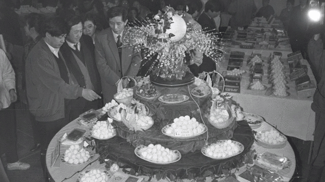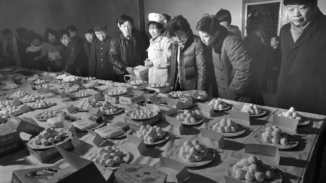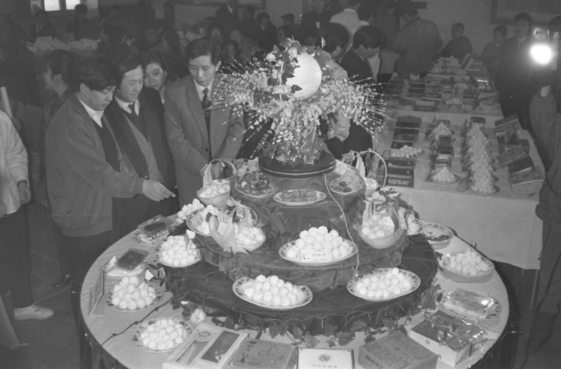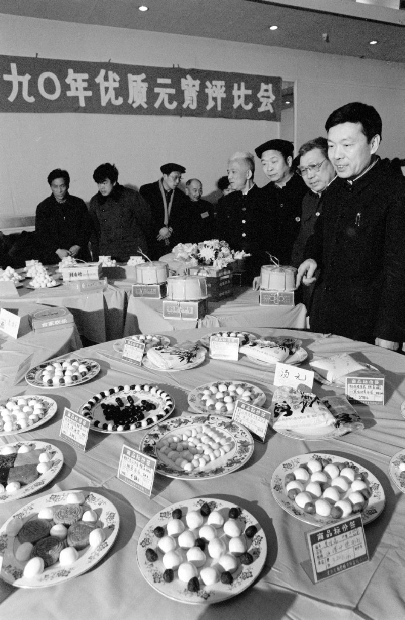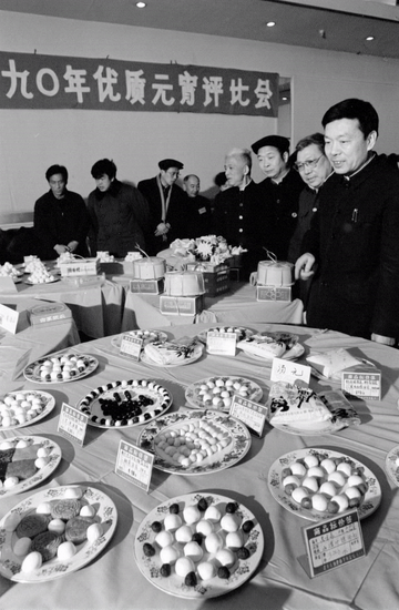 1990年2月6日,北京市饮食业和糕点业举行元宵、汤圆质量评比活动。全市40个单位的82种元宵和汤圆参赛。最终,桂香村食品店的黑芝麻元宵和峨嵋酒家的黑芝麻汤圆分别夺魁。新华社发(戴纪明 摄)
