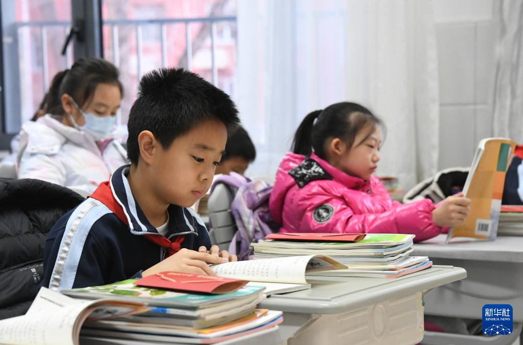 2月17日,北京市海淀区中关村第二小学(华清校区)四年级(6)班的学生在教室内阅读。