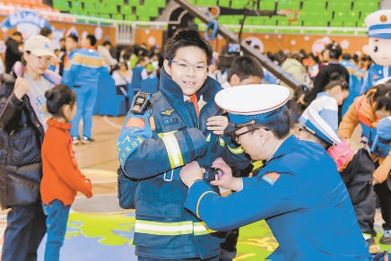 当天的室内活动区域设置了丰富多彩的互动项目,包括为西城消防卡通形象“胖哒”涂装、消防知识猜灯谜、非遗文化体验、消防主题绘画、消防“大富翁”飞行棋游戏,消防战斗服体验、消防器材展示等。
