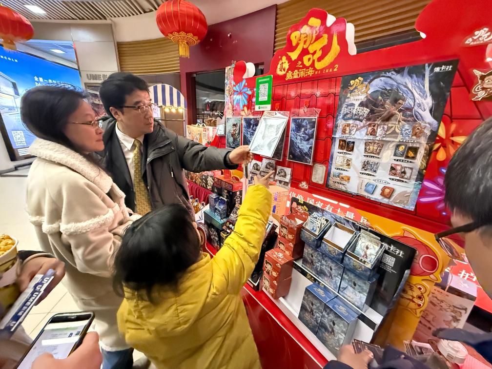 除了盲盒产品,《哪吒2》电影收藏卡、剧情胶片卡等周边也销售火爆。一些获得官方授权的线上旗舰店上新《哪吒2》周边卡牌,仅一周时间便卖出超过70万张,累计成交额突破百万元。在一些电影院内,“哪吒骑飞天猪”造型的爆米花桶成为爆款,上市仅两三天就卖断货。