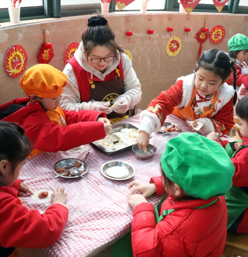 2月27日,江苏省宜兴市均陶幼儿园的老师带领孩子们包“龙耳”。新华社发(丁焕新摄)