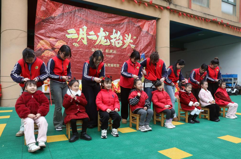 2月27日,江苏省宜兴市均陶幼儿园的老师为孩子们“梳龙头”“扎龙辫”。新华社发(丁焕新摄)