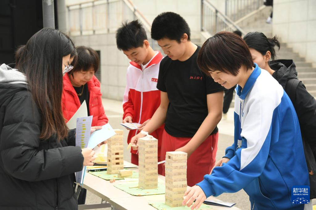 3月14日,学生在北京大学附属中学第二届“数学文化节”数学游园会活动中参与“数学叠叠乐”游戏。
