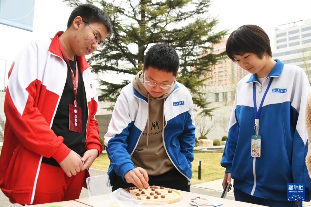 3月14日,学生在北京大学附属中学第二届“数学文化节”数学游园会活动中参与孔明棋游戏。