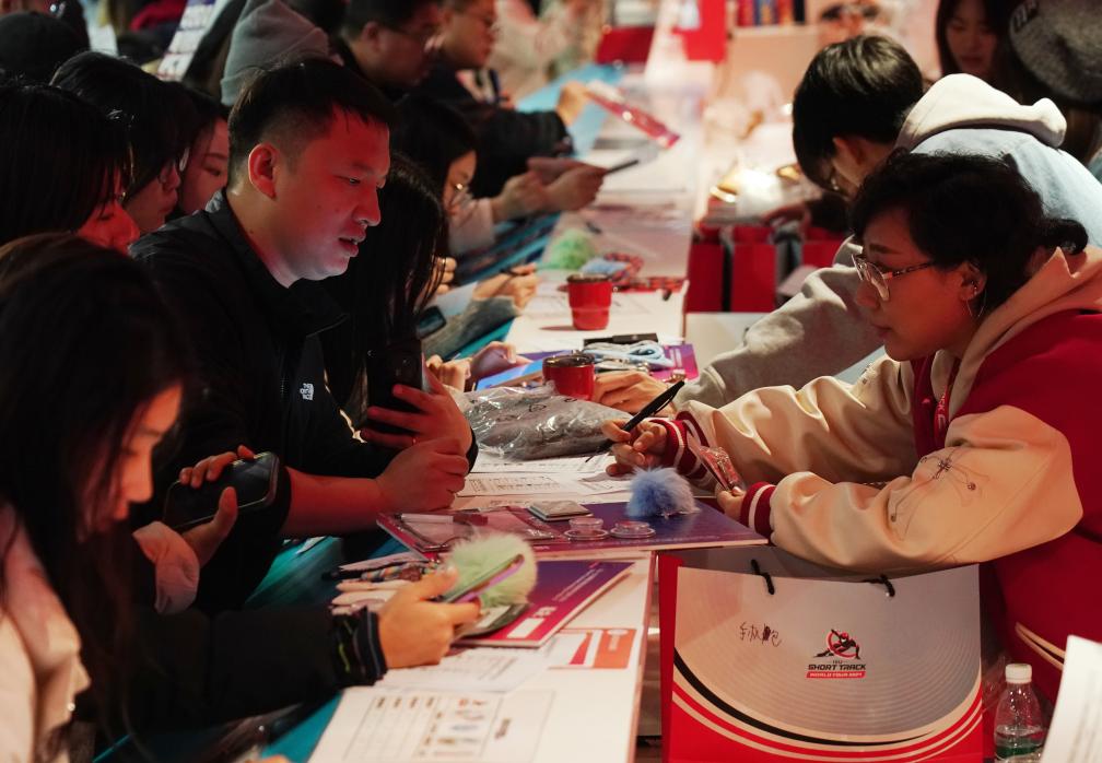 2024年12月7日,观众在首都体育馆购买2024-2025赛季国际滑联短道速滑世界巡回赛赛事官方特许商品。新华社记者 张晨霖 摄