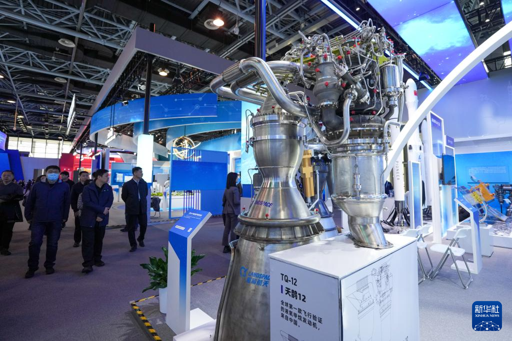 3月28日,在中关村展示中心常设展内,参观者在商业航天展示区域参观展出的“天鹊-12”液氧甲烷发动机。