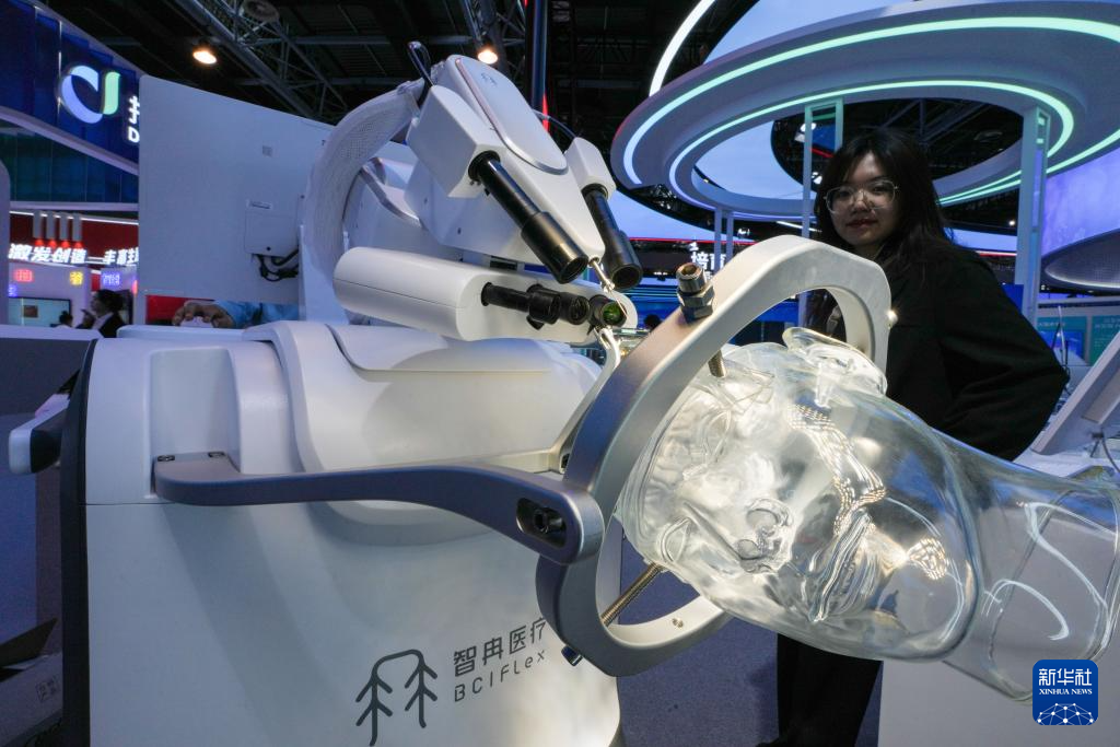 这是3月28日在中关村展示中心常设展内拍摄的一款电极植入机器人。