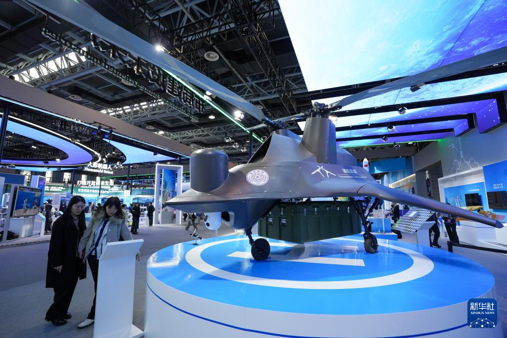 3月28日,在中关村展示中心常设展内,参观者在参观展出的一款重型交叉双旋翼无人直升机。