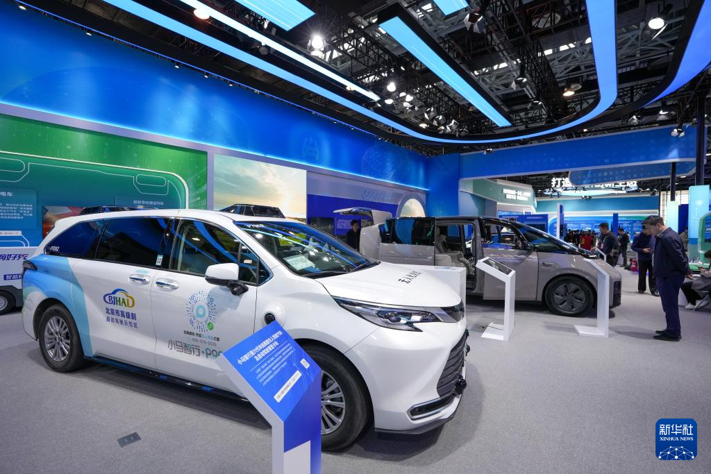 3月28日,在中关村展示中心常设展内,参观者参观展出的智能网联汽车。