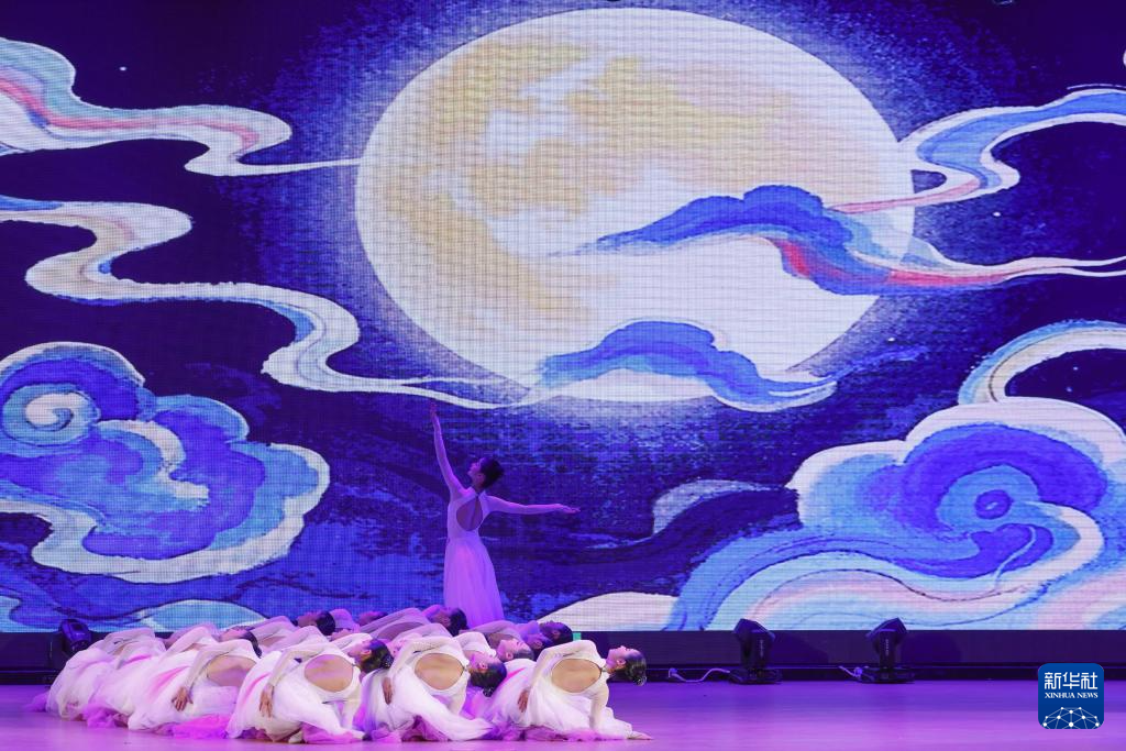 3月28日,北京师范大学附属中学金帆舞蹈团的孩子们在表演舞蹈《彩云追月》。