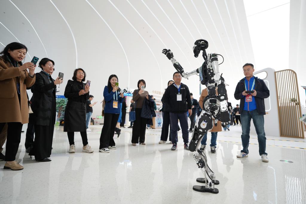 在中关村国际创新中心,与会嘉宾和记者在观看一款人形机器人表演(3月27日摄)。新华社记者 鞠焕宗 摄