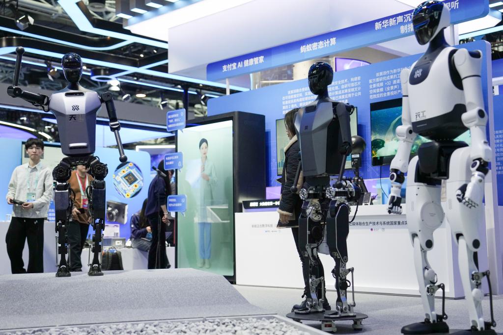 3月27日,2025中关村论坛年会与会嘉宾与一款加速T1机器人握手。新华社记者 张晨霖 摄