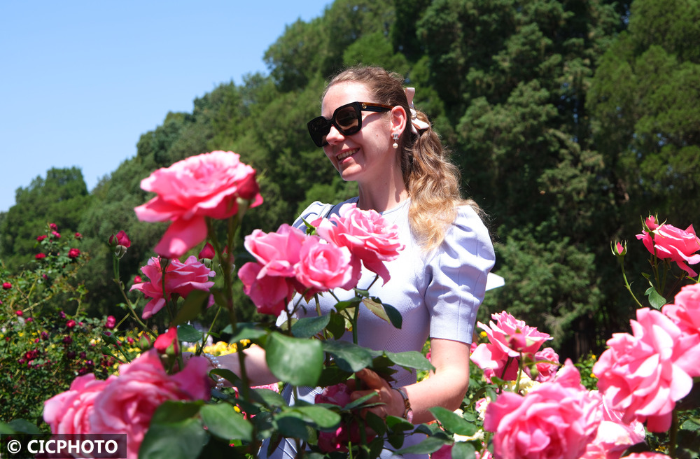 2025年5月19日,一名外国游客在北京天坛公园月季园赏花。CICPHOTO/郭俊锋 摄