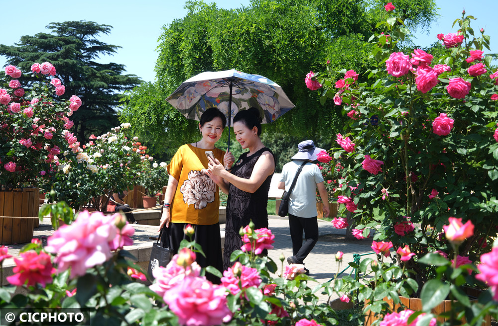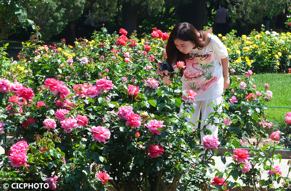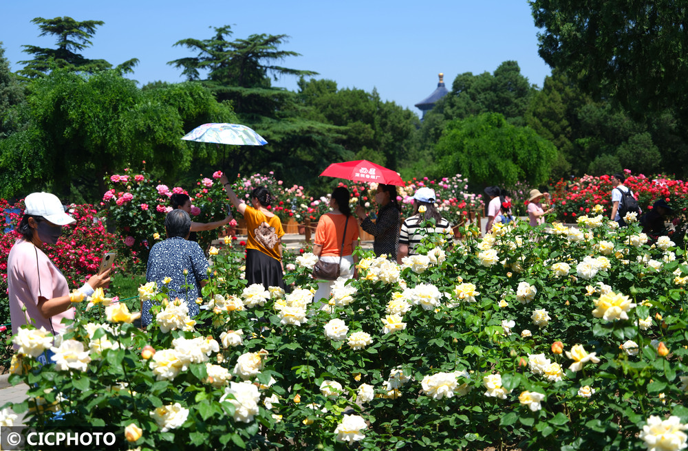 2025年5月19日,游客在北京天坛公园月季园赏花。CICPHOTO/郭俊锋 摄