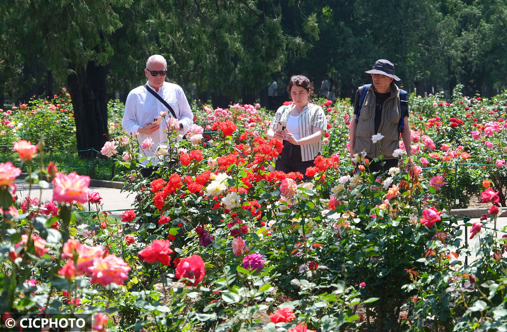 2025年5月19日,几名外国游客在北京天坛公园月季园赏花。CICPHOTO/郭俊锋 摄
