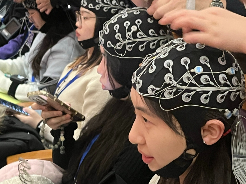 高小榕介绍,此系列研究的重要突破在于通过多人多组的同步采集,在真实演出现场实现了实验室研究级的脑电采集。学生们所戴的脑电帽上布满银白色的电极接口,用以采集脑电信号,通过手臂上佩戴的微型数据采集器,进行情感相关信息的记录。这些数据将无线传输至数据中心,对艺术体验中的生理响应进行分析。