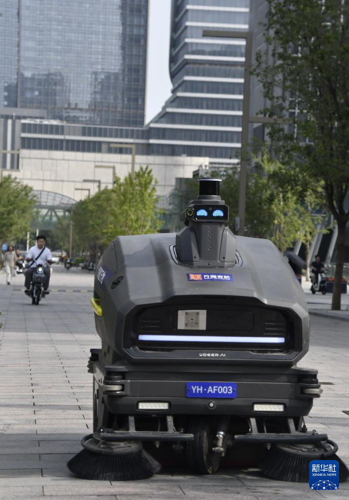 8月16日,一台机器人保洁员在通州区运河商务区清扫街道。