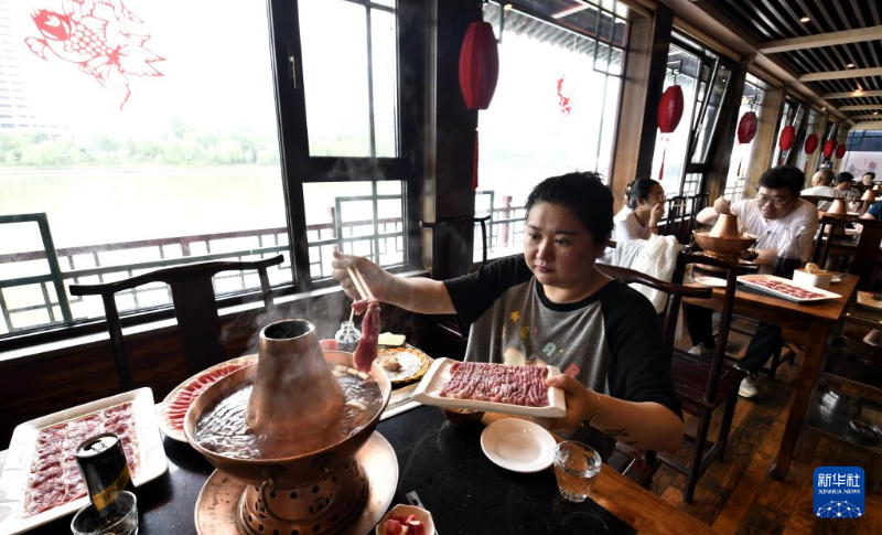 8月16日,市民在运河上的游船餐厅内品尝北京特色火锅。
