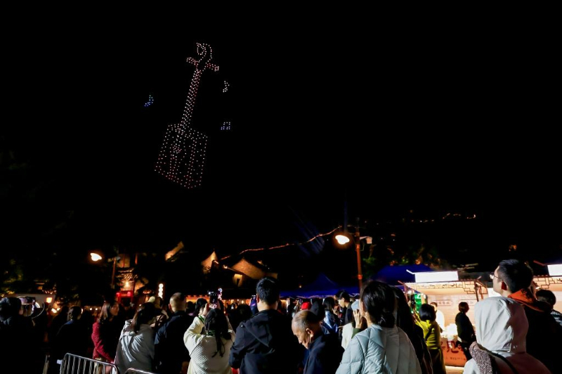 9月23日晚,在北京市密云区古北水镇,游客欣赏、拍摄无人机表演。(北京市密云区供图)