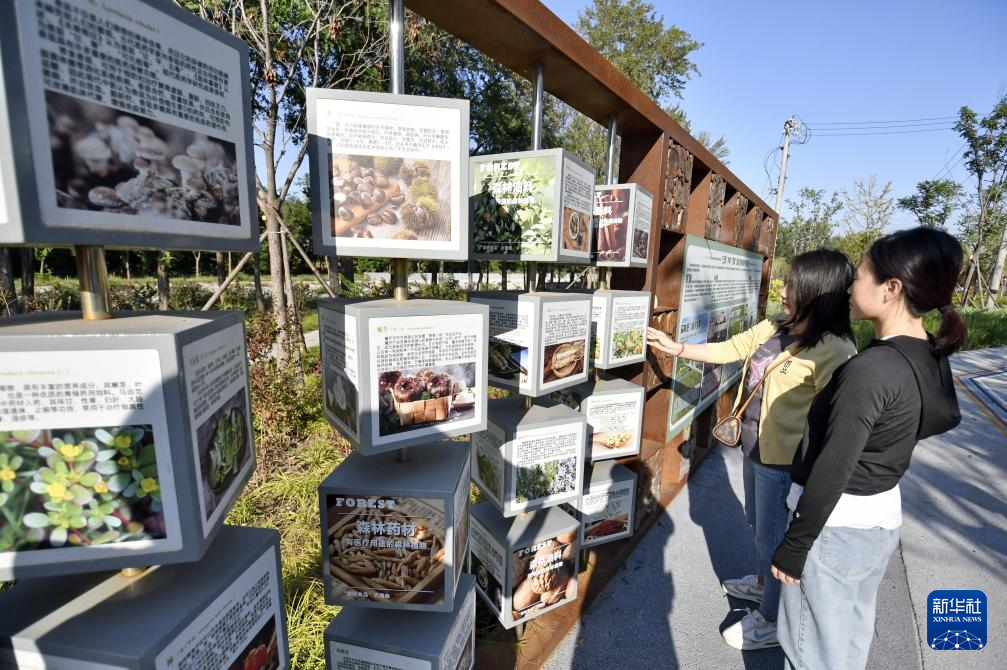 9月24日,市民在顺义区后沙峪镇的一处林间小型公园内观看中药材科普画廊。