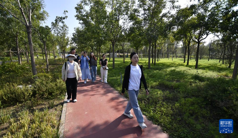 9月24日,市民在顺义区后沙峪镇温榆河公园内的林间休闲游览。