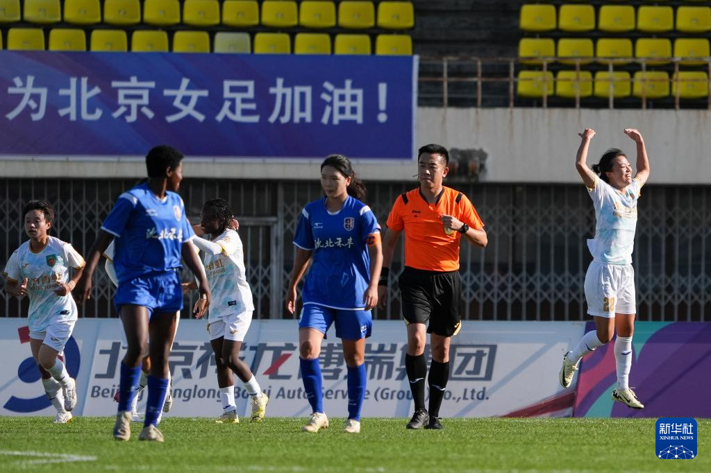 9月28日,北京东方雨虹队球员赵瑜洁(右三)、萨拉图·特劳雷(右二)在比赛结束后庆祝。