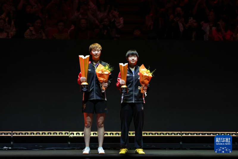 10月5日,冠军王曼昱(左)和亚军孙颖莎在颁奖仪式上合影。