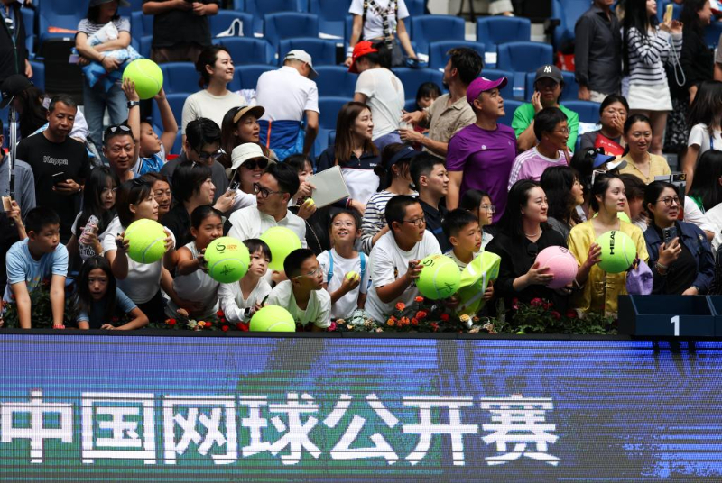 10月1日,北京国家网球中心钻石球场举行2025中国网球公开赛男子单打决赛。这是观众在赛后等待选手签名。新华社记者 杜昕怡 摄