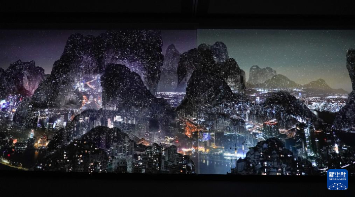 在“贵在意”展览中,除了传统画作,也有承续了写意观念的当代装置、新媒体作品。一幅当代艺术家杨泳梁的“数字山水”巨幅动态影像作品将宋代山水画和现代都市夜景相融,吸引不少观众驻足。