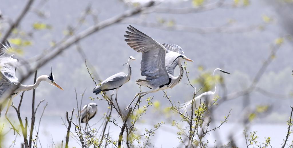 2025年4月23日,在密云水库觅食喂养小鸟的苍鹭群。新华社记者 李欣 摄