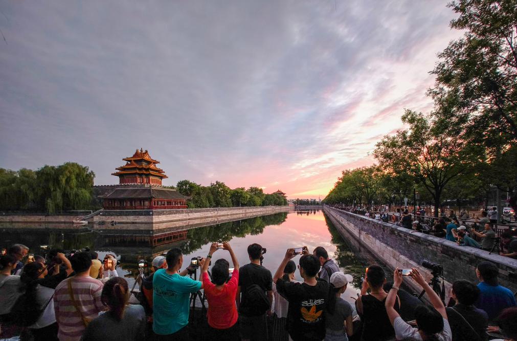 2025年7月20日,人们在拍摄晚霞中的北京故宫东北角楼(手机照片)。新华社记者 陈晔华 摄
