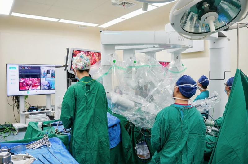 术中主刀医生在国产精锋手术机器人及远程手术系统的辅助下,精准控制远在“千里之外”的机械臂,为患者顺利切除病灶,并最大限度保留了尿道长度,而后精细缝合膀胱颈与尿道,完成尿路重建,并顺利完成手术。