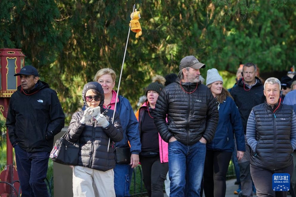 10月18日,在北京天坛公园,几名外国游客穿着羽绒服参观游览。