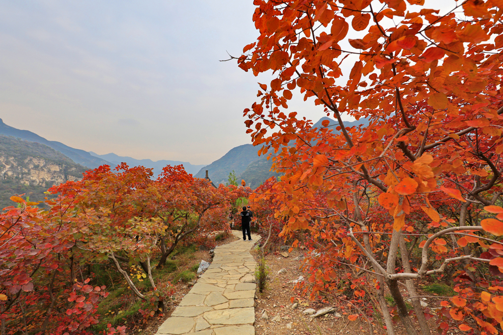 深秋时节,位于北京市房山区的坡峰岭景区进入红叶最佳观赏期。包括黄栌、元宝枫等品种在内的十余万株红叶植物吸引了众多游客登高赏红。