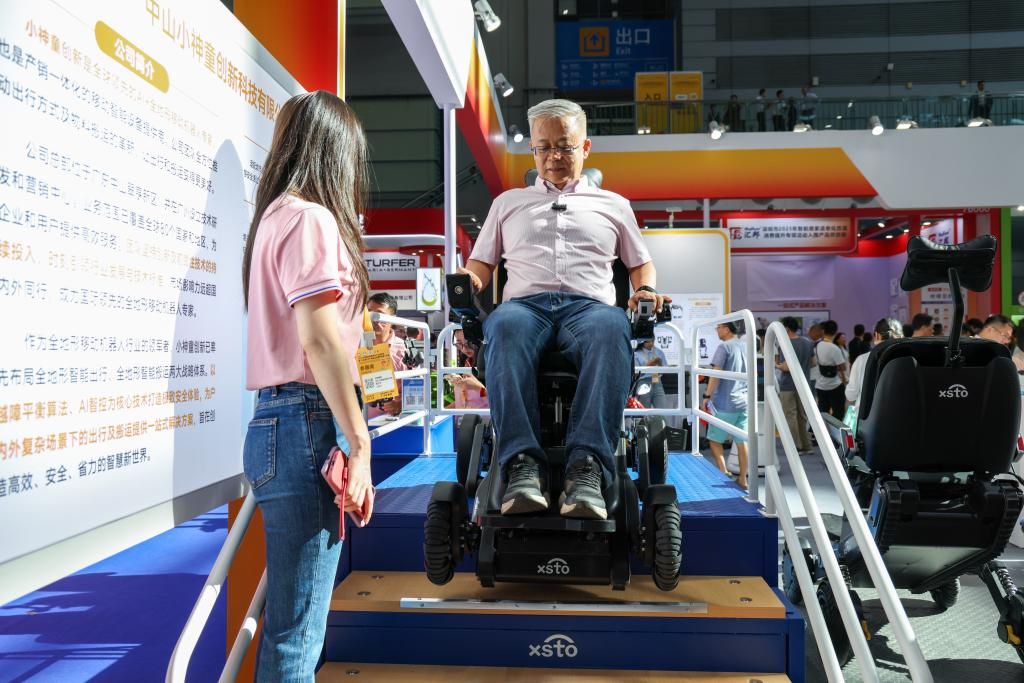 9月12日,观众在国际智慧养老产业博览会现场体验智能出行机器人。新华社记者 梁旭 摄