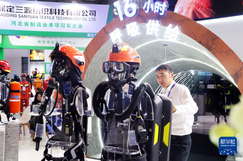 11月18日,工作人员在展览现场向参观者介绍消防救援装备。
