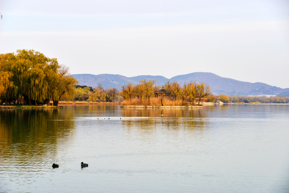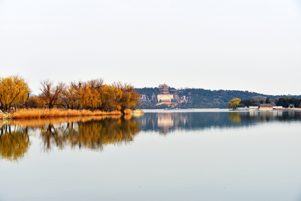 冬日清晨,北京颐和园笼罩在薄雾中,佛香阁与湖面相映成景,柳枝残荷点缀其间,宛若一幅幅水墨画卷。
