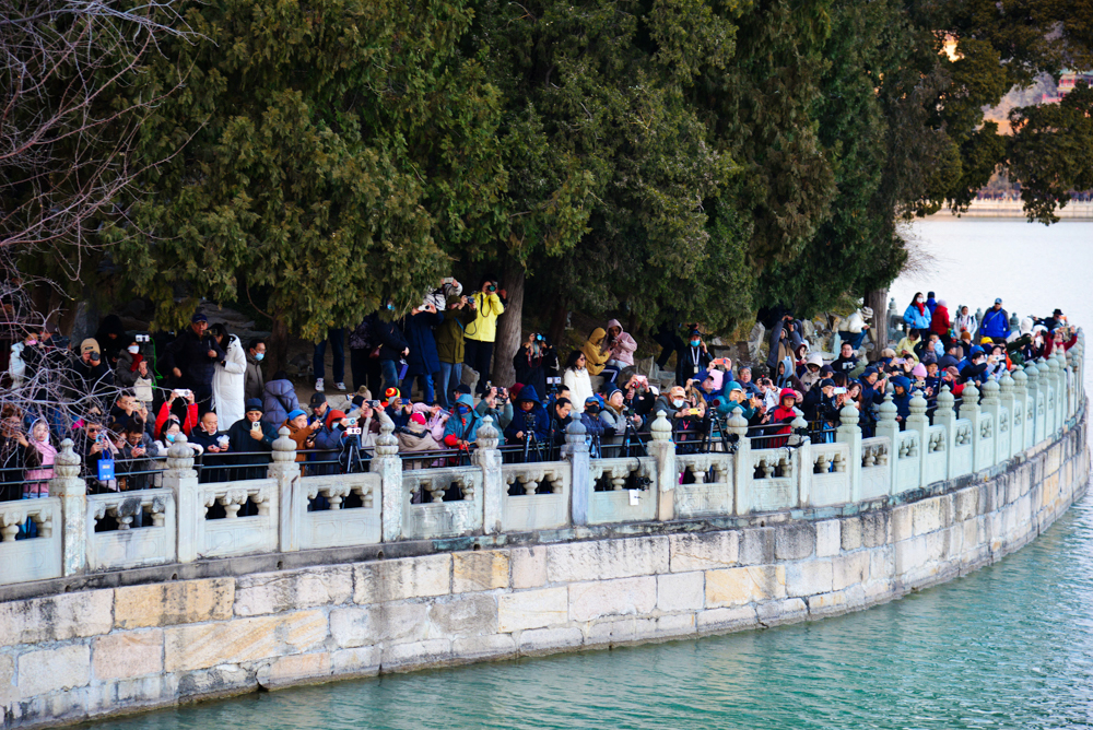 2025年12月1日,游客在北京颐和园拍摄“金光穿洞”景观。CICPHOTO/樊甲山 摄