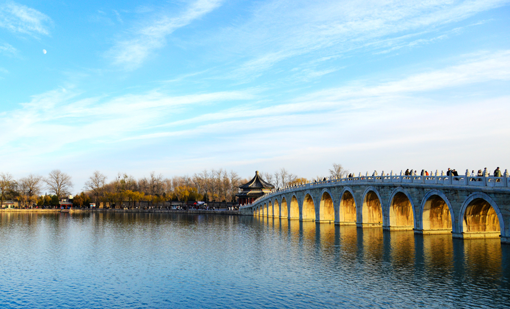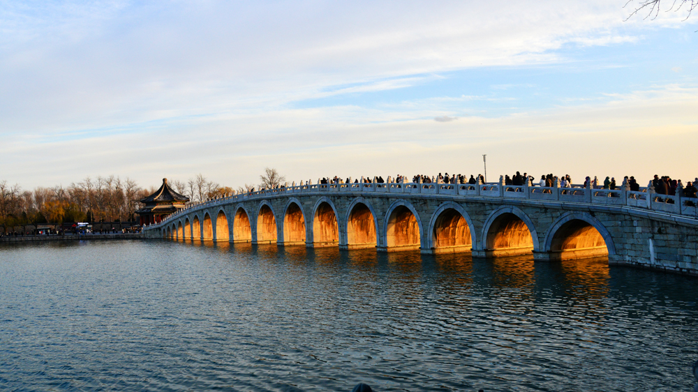 2025年12月1日,北京颐和园十七孔桥上演“金光穿洞”自然景观,吸引游客和摄影爱好者观赏拍照。