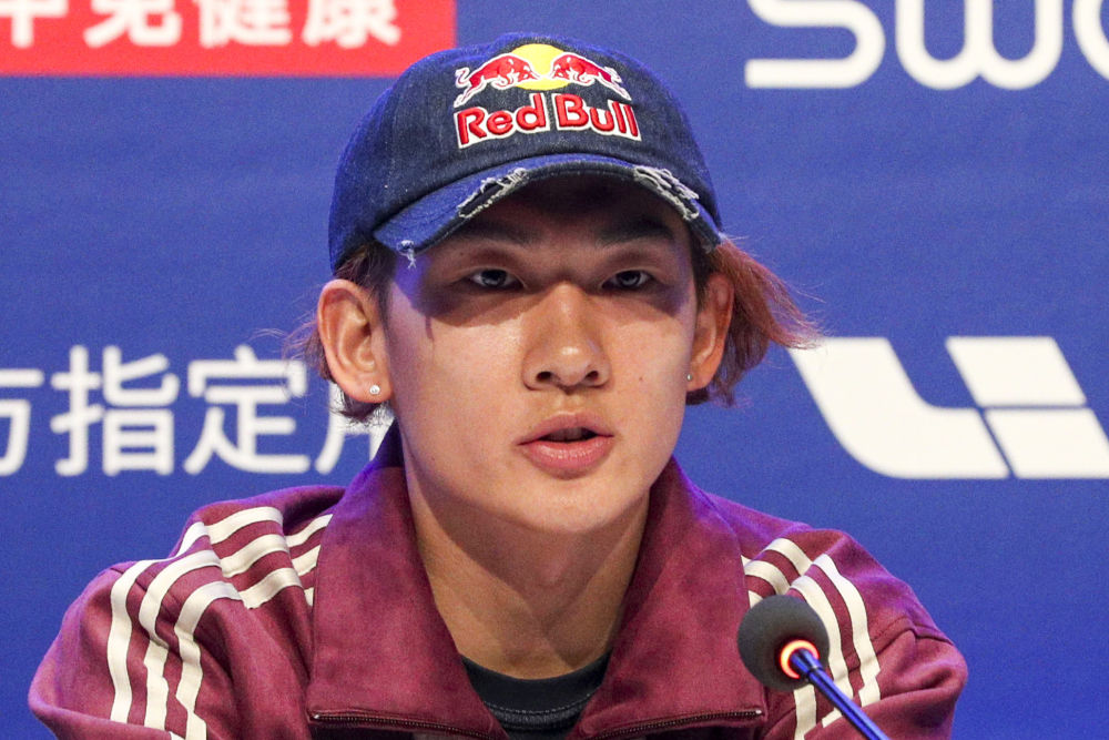 12月2日,国际雪联单板及自由式滑雪大跳台世界杯北京站赛前运动员见面会在北京举行。图为苏翊鸣在见面会现场。新华社发(马子涵摄)