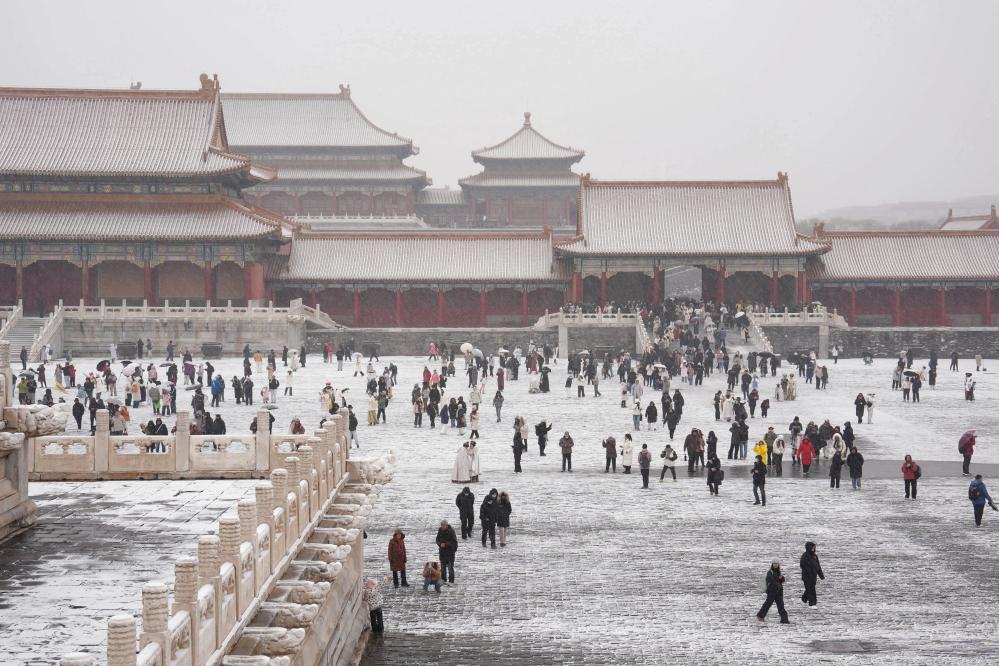 12月12日,游客冒雪参观北京故宫。